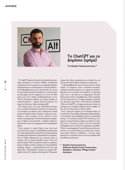 Δημοσιεύθηκε στην Οικονομική Επιθεώρηση, 25.03.2023 Το παράδειγμα του ChatGPT Αυτή την περίοδο ολόκληρο τον πλανήτη φαίνεται να έχει συνεπάρει η εφαρμογή τεχνητής νοημοσύνης ChatGPT. Πρόκειται για ένα chatbot που δημιουργήθηκε από τη νεοφυή επιχείρηση (startup) OpenAI, το οποίο χρησιμοποιεί αλγόριθμους Τεχνητής Νοημοσύνης τόσο καλά ώστε να μπορεί να ανταποκριθεί με πρωτοφανή ικανότητα σε οποιοδήποτε αίτημα…